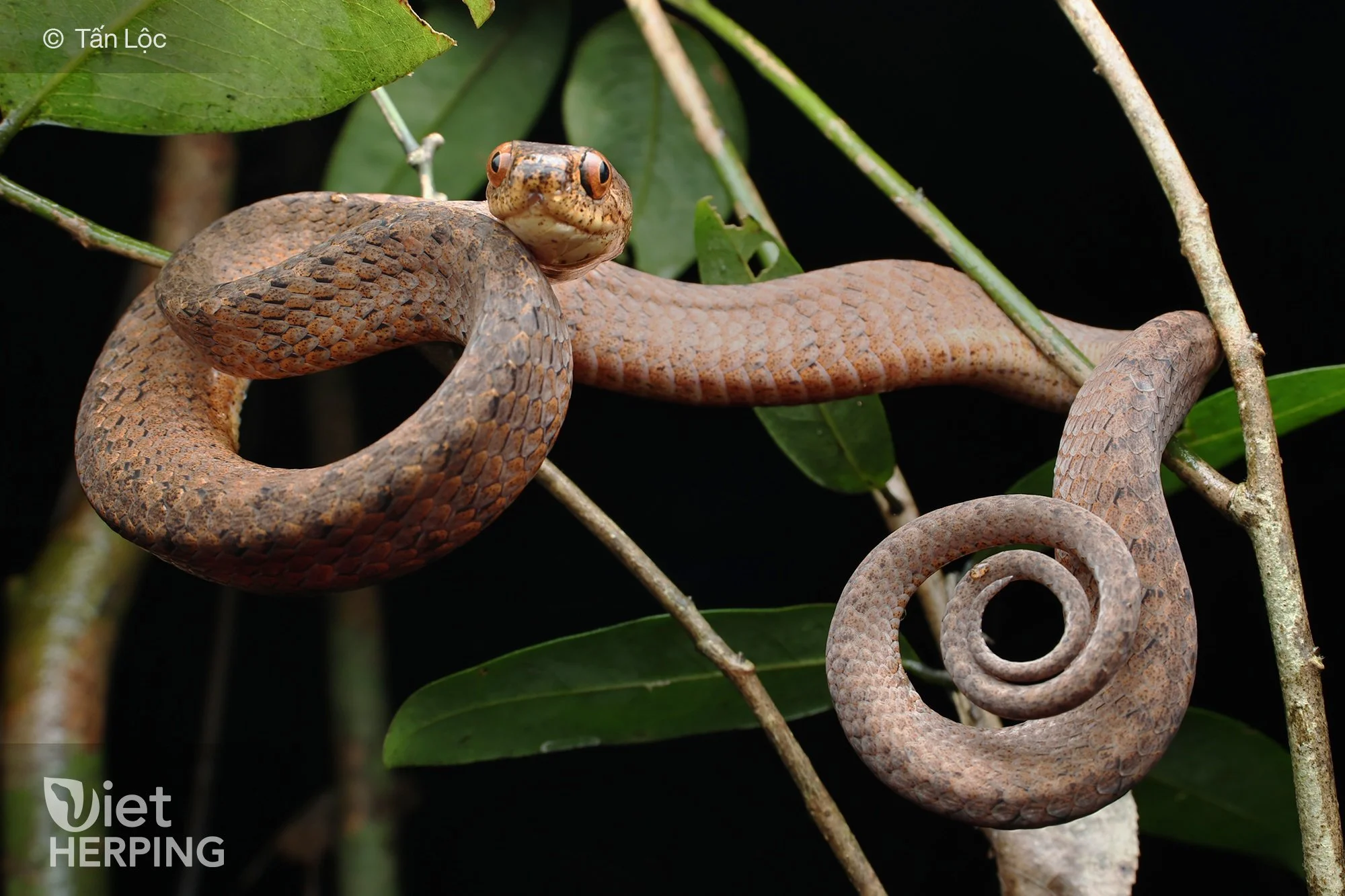This is a delicate arboreal beauty, often found more than 10 meters high in the forest canopy. Its slender body features subtle browns and intricate patterns that blend seamlessly with the leaves. Spotting this elusive snake gliding gracefully through the trees offers a rare, unforgettable glimpse into Vietnam’s rich reptile diversity and adds a magical moment to any herping adventure.