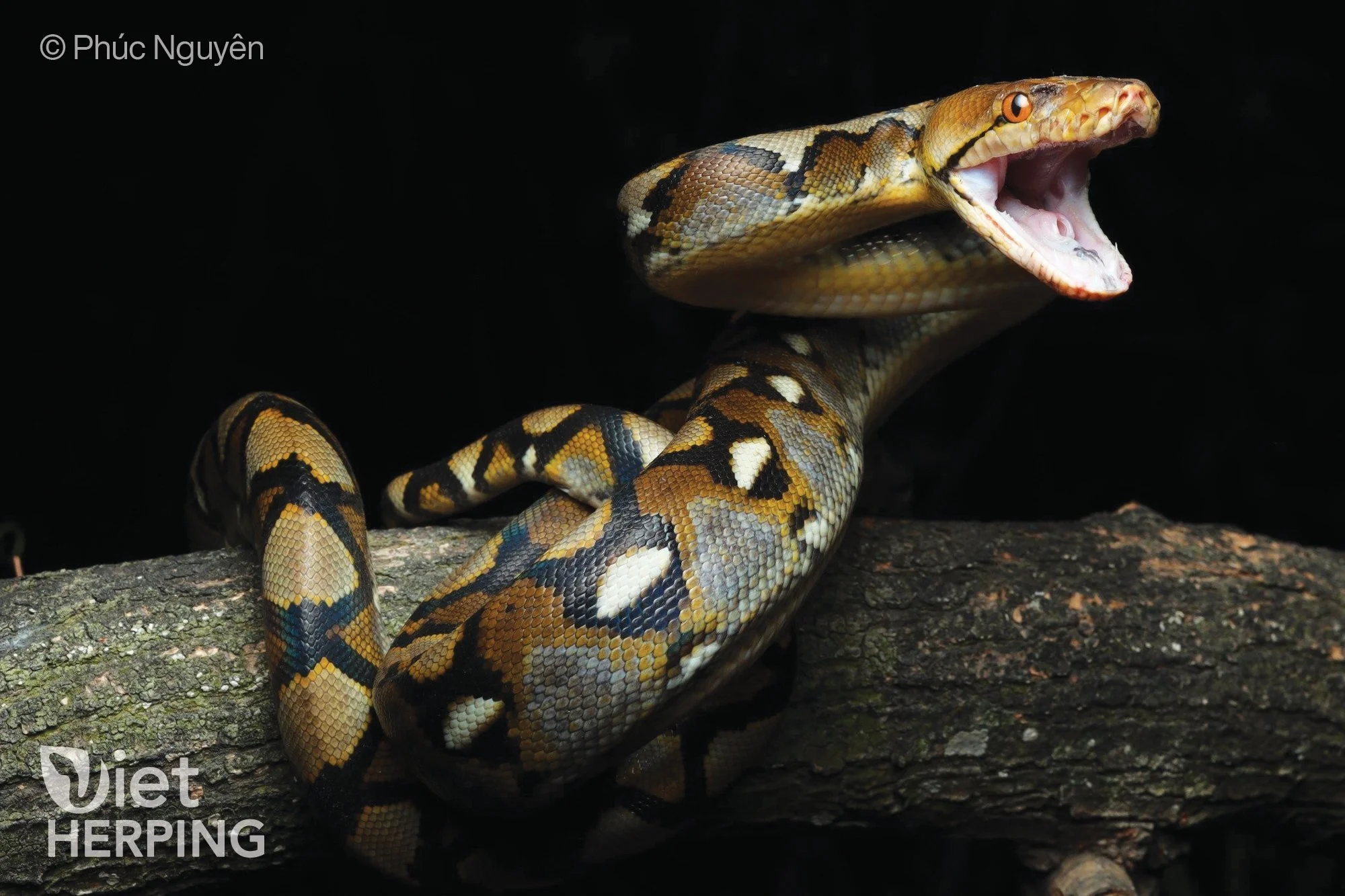 The Reticulated Python (Malayopython reticulatus) is one of the most magnificent snakes found in Vietnam’s wild landscapes. Known for its intricate net-like pattern and impressive size, this python captivates herping enthusiasts with every sighting. Encountering this powerful yet graceful reptile in its natural habitat offers a thrilling and unforgettable experience, showcasing the rich biodiversity of Vietnam’s forests.